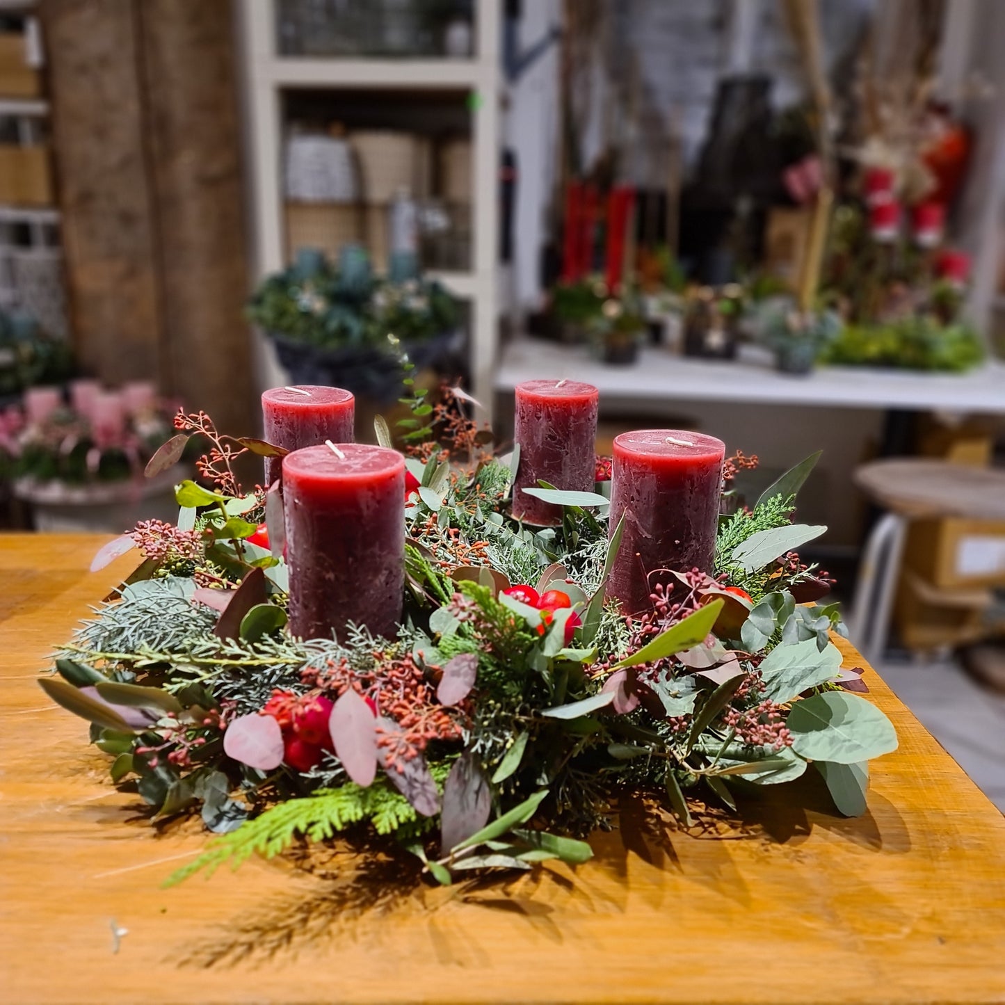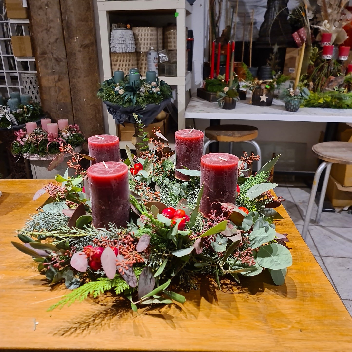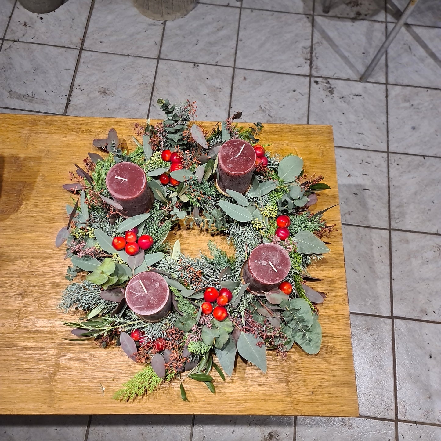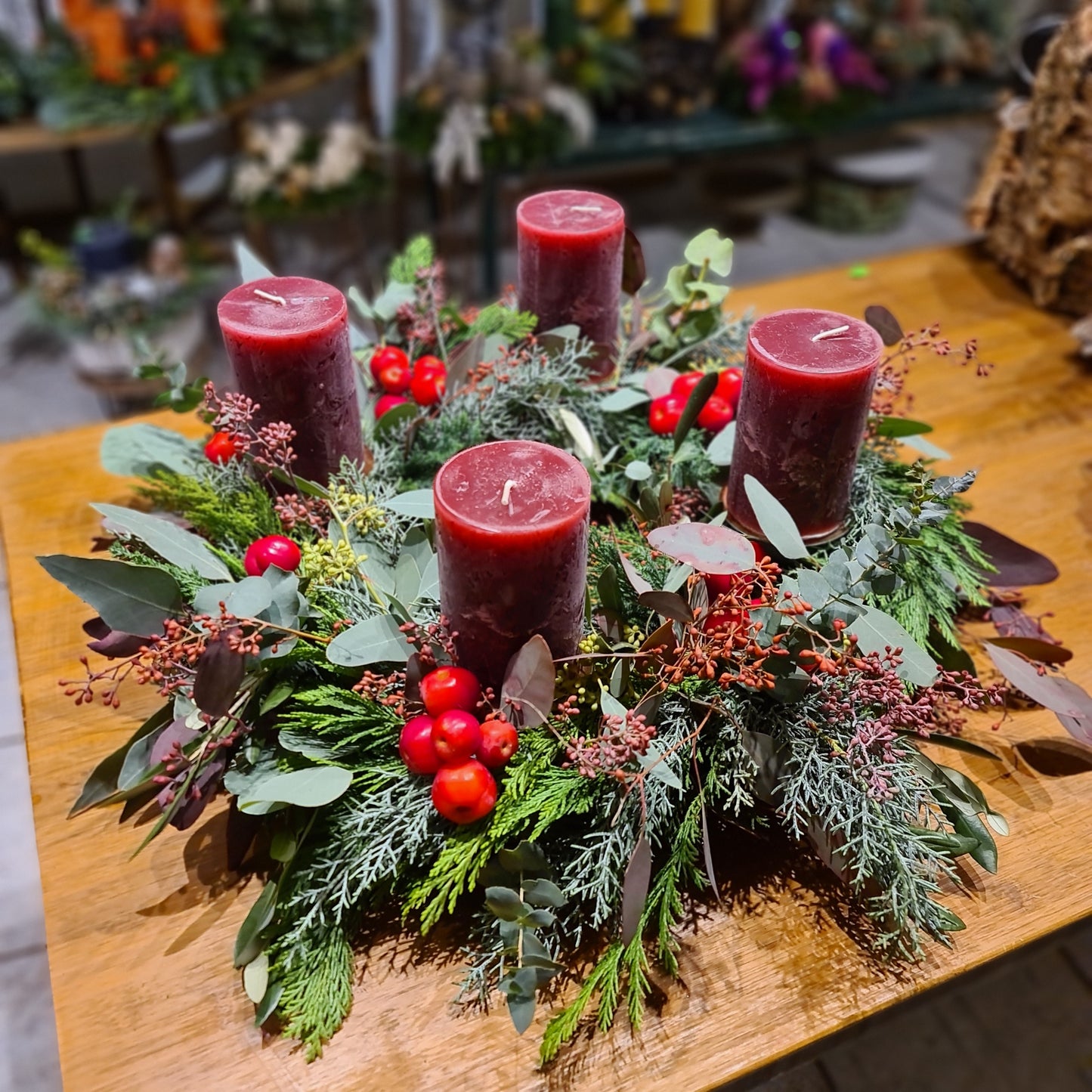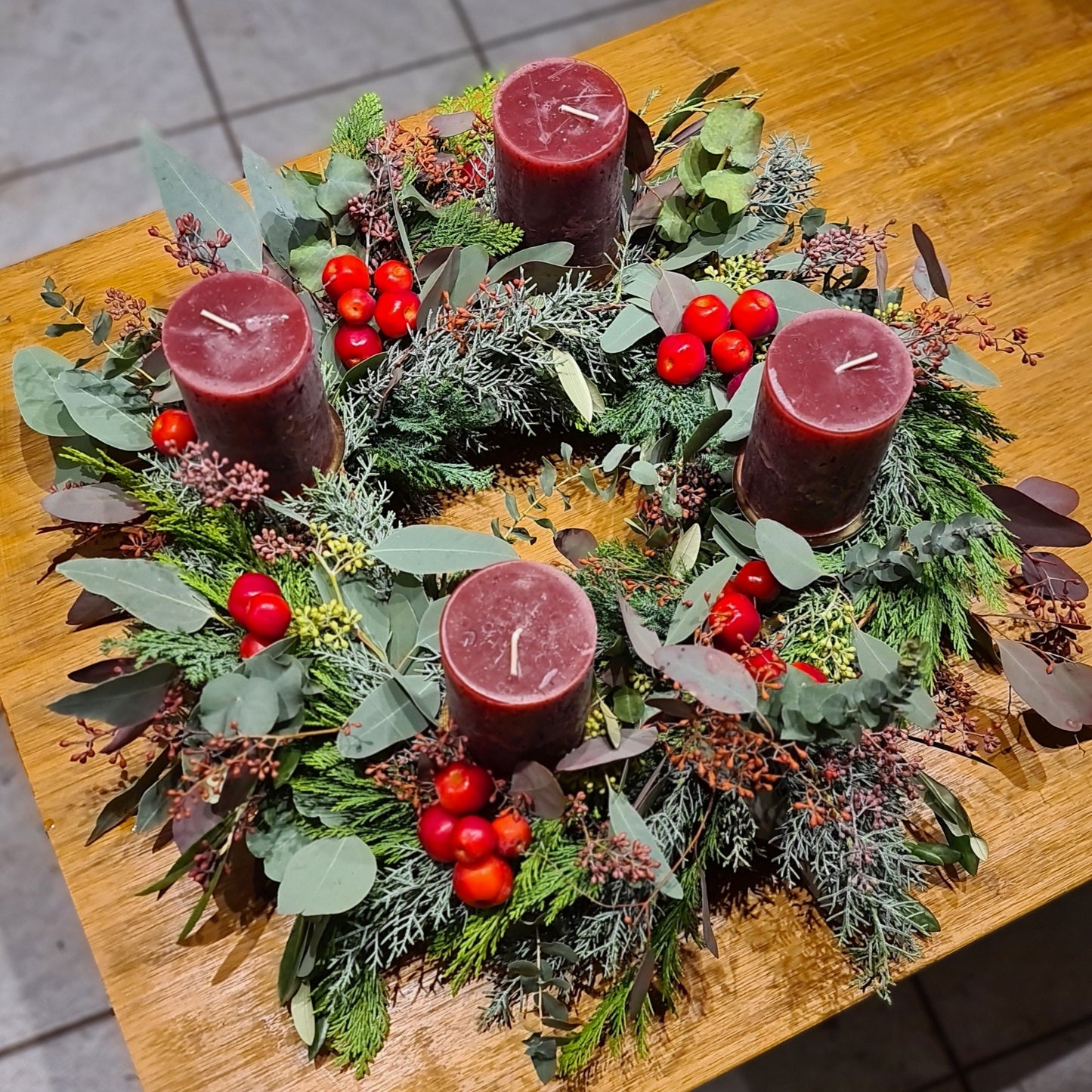 Bezaubernder natürlicher Adventskranz mit gemischtem Grün, Eucalyptus und Zieräpfel.