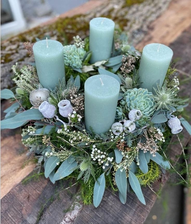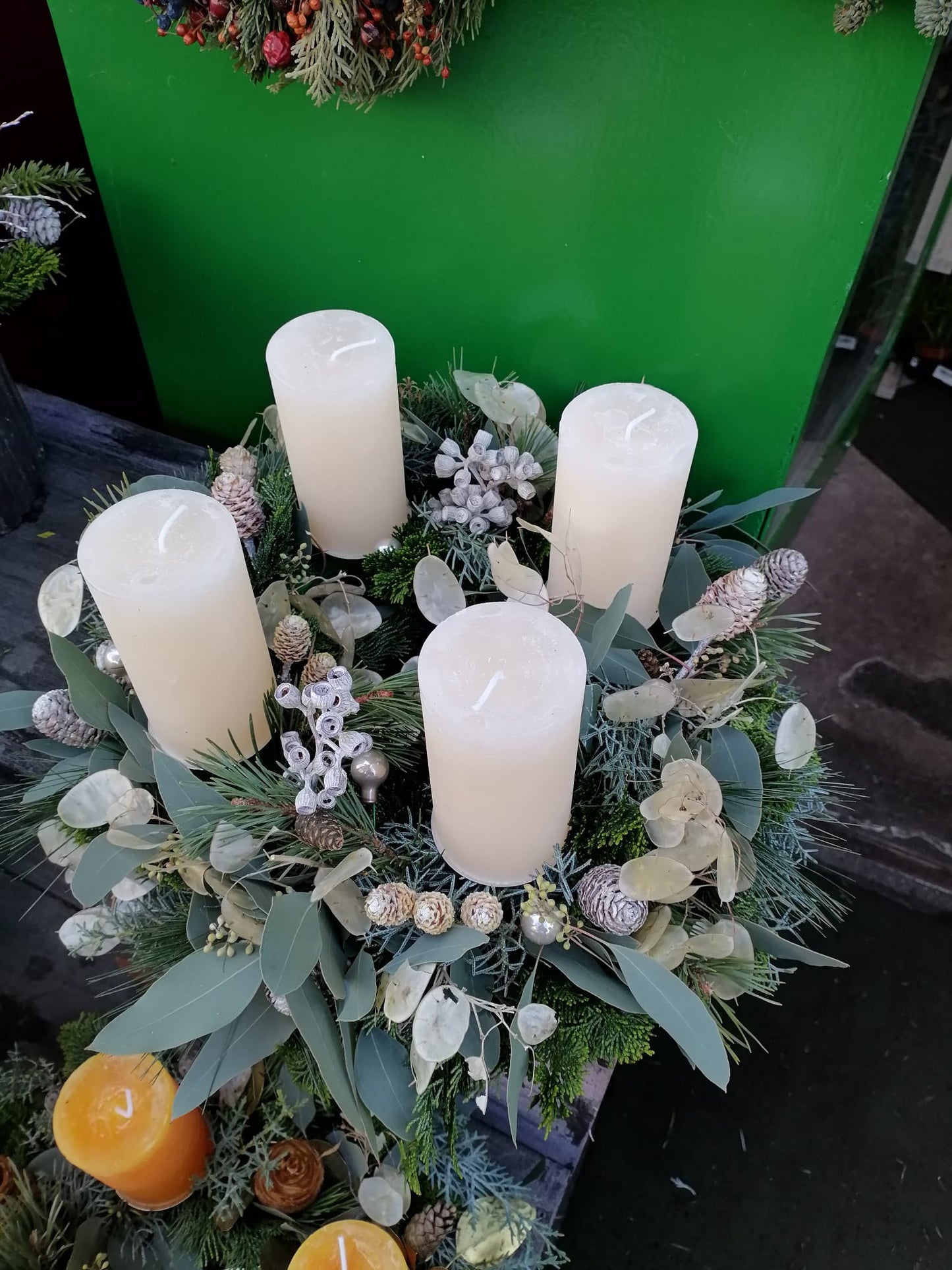 Der Adventskranz hat 48 bis 53 cm außen Durchmesser, durchgefärbten Kerzen 110/70 mm und alle Farben möglich.
