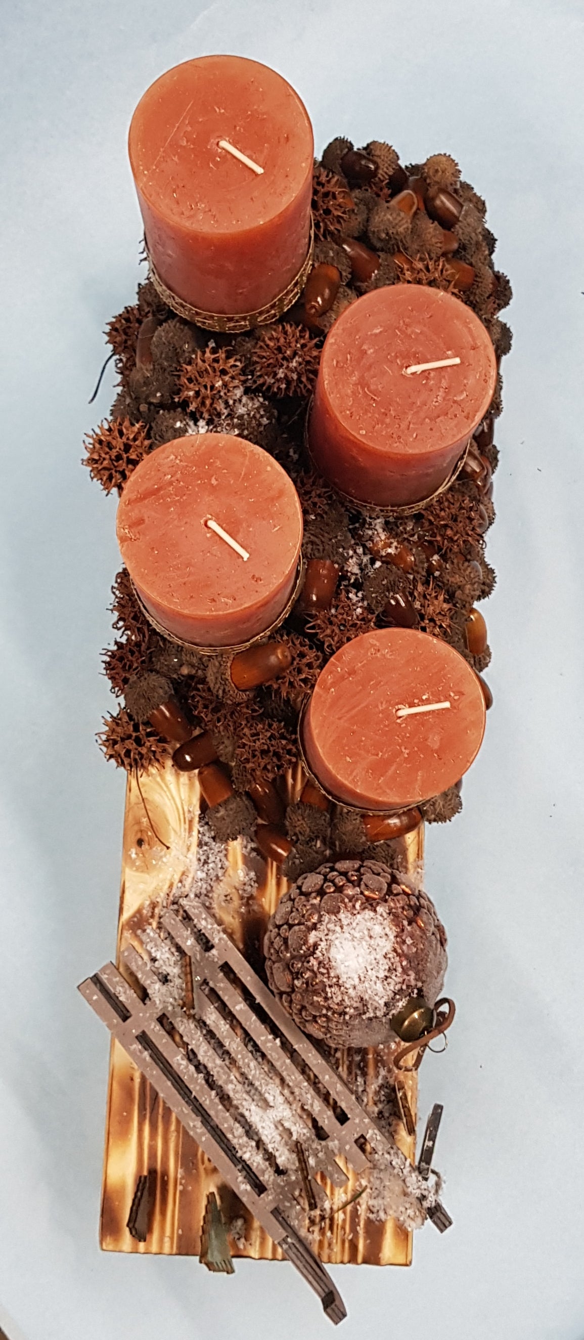 Modernes braunes Adventsgesteck mit durchgefärbten Zylinder Kerzen, einer Weihnachtskugel, einem Schlitten und Eicheln. 50 cm Länge, 25cm Höhe und 25cm Breit. Mehrere Jahre verwendbar mit neuen Kerzen.
