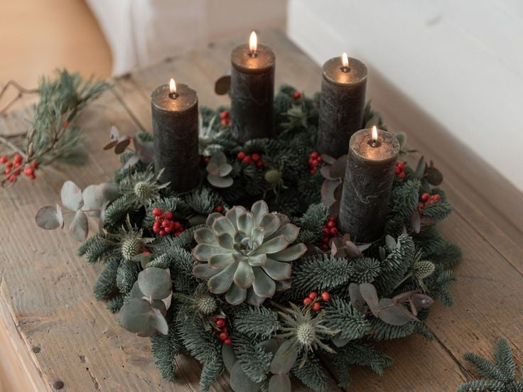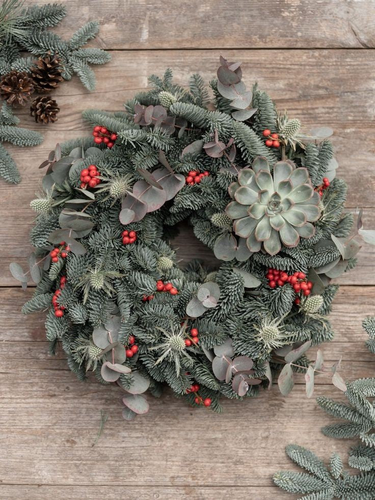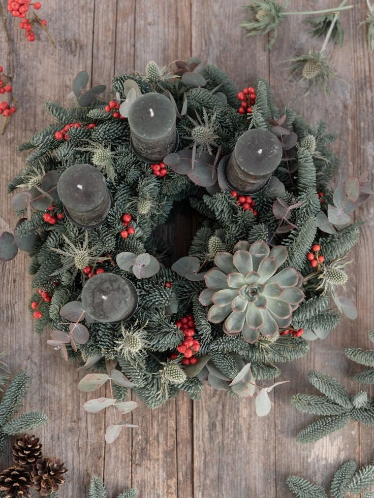 Natürlicher Adventskranz mit Nobilis Tanne, Sukkulente und Ilix Beeren. Sie kriegen den Kranz vor dem ersten Advent ganz frisch gefertigt. Damit der Kranz bis Weihnachten frisch bleibt.