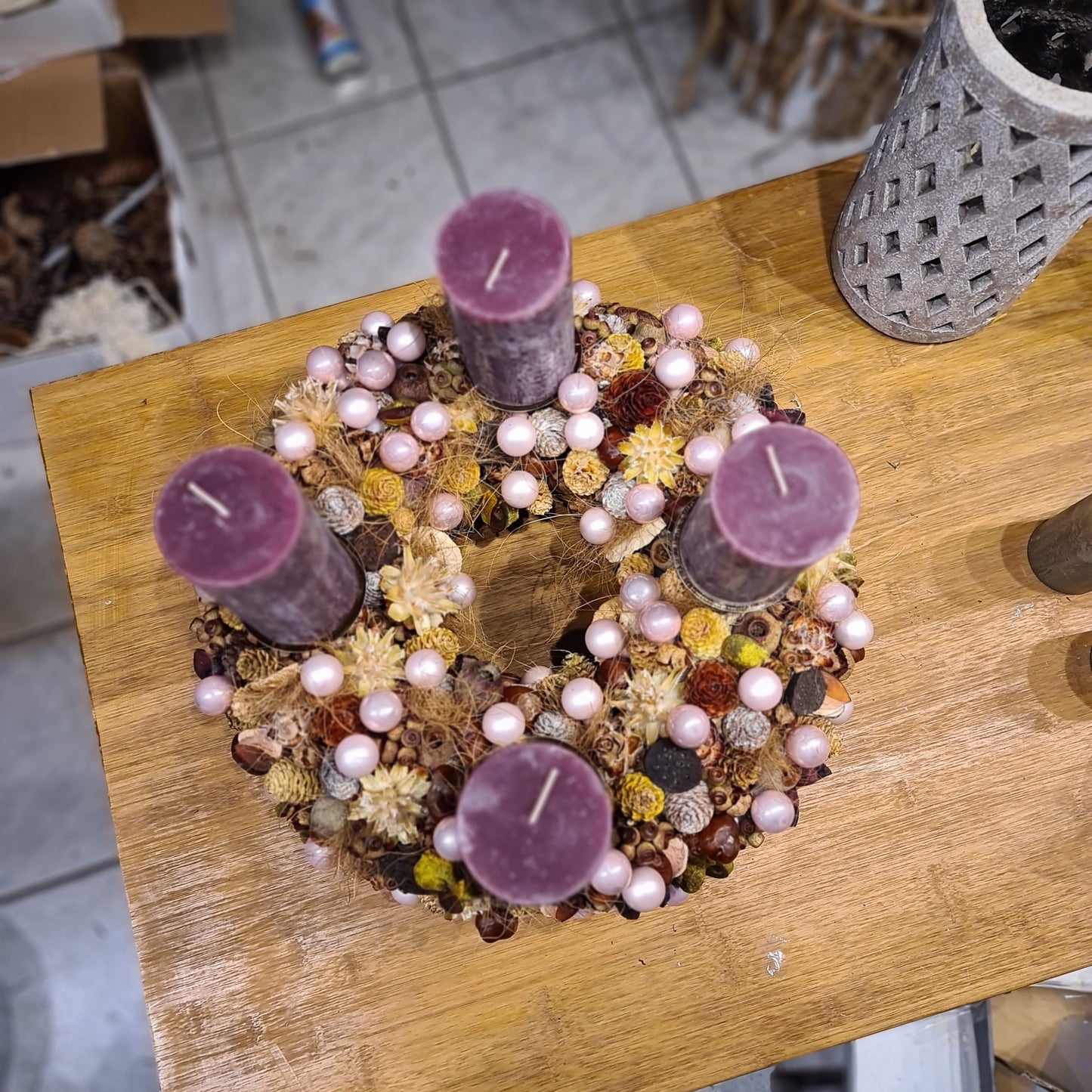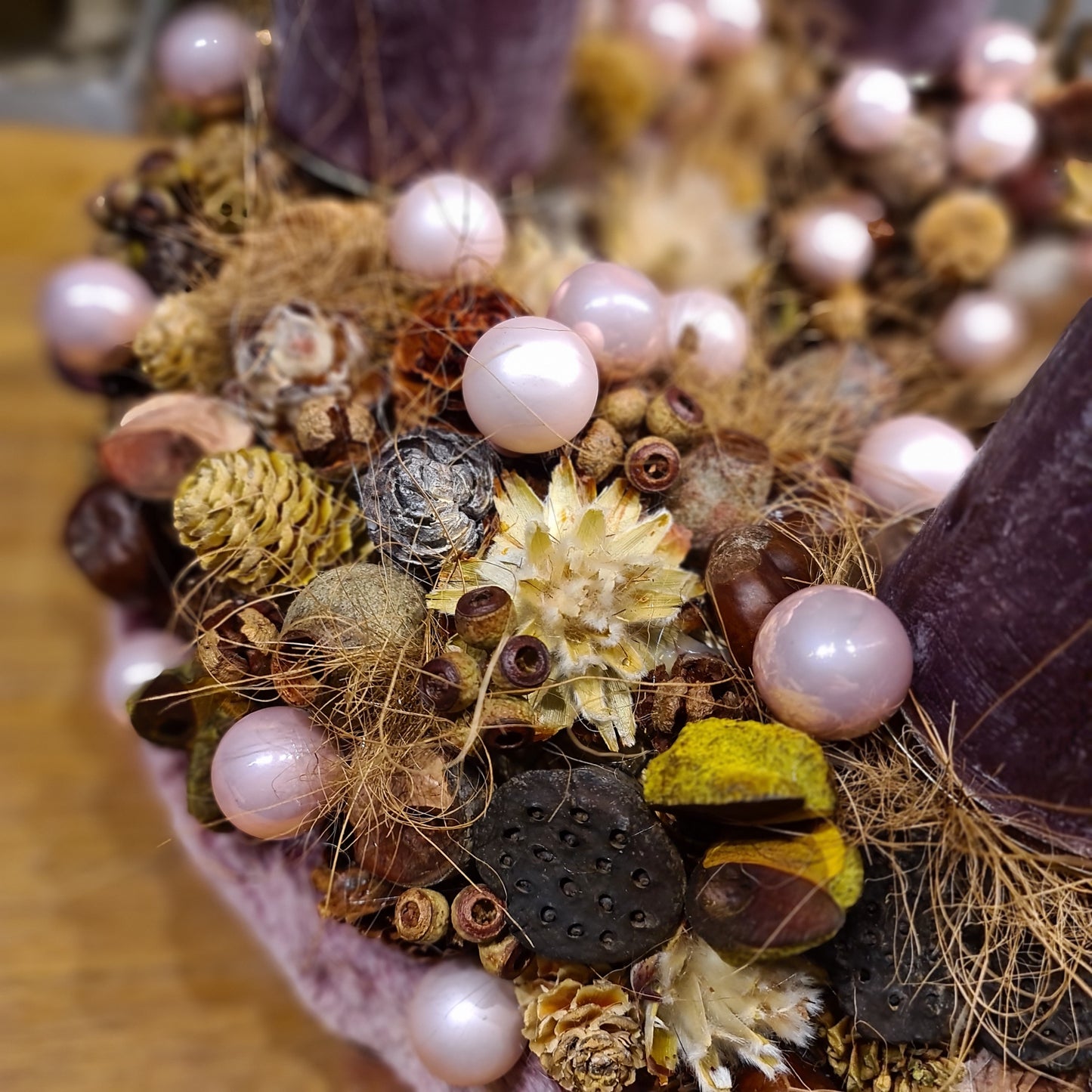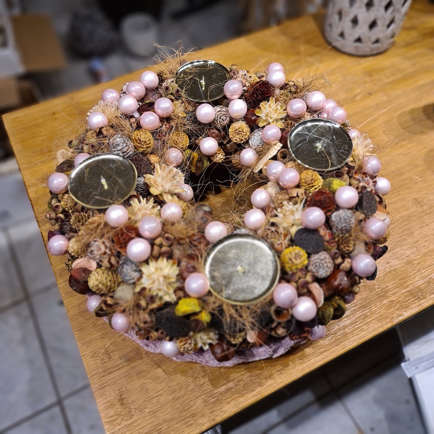 Sehr sorgfältig achte ich auf die Auswahl der Materialien. Hier habe ich verschiedene Weihnachtskugeln aus Glas, sowie Spiegelbeeren, Lärchen-, Föhren- und Fichtenzapfen, Holzsterne, Birkensterne und Eukalyptusglocken verwendet. Bei der Basis handelt es sich um einen sehr schön gearbeiteten weiß gekalkten Weidenkranz. Diese Weihnachtsdeko wird bei Ihnen bestimmt zum Hingucker.