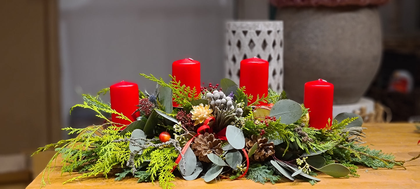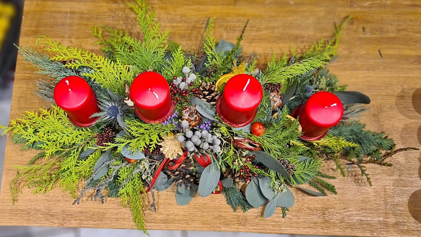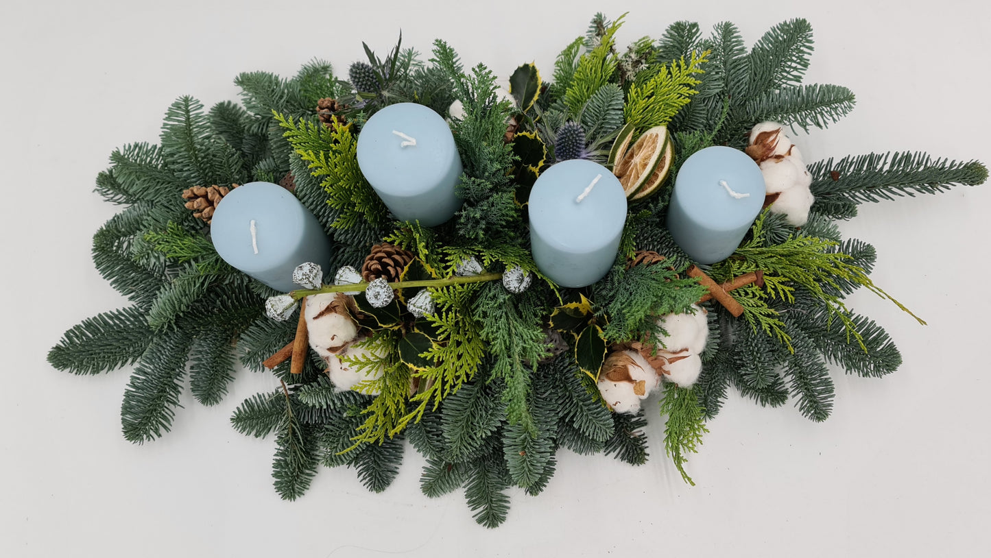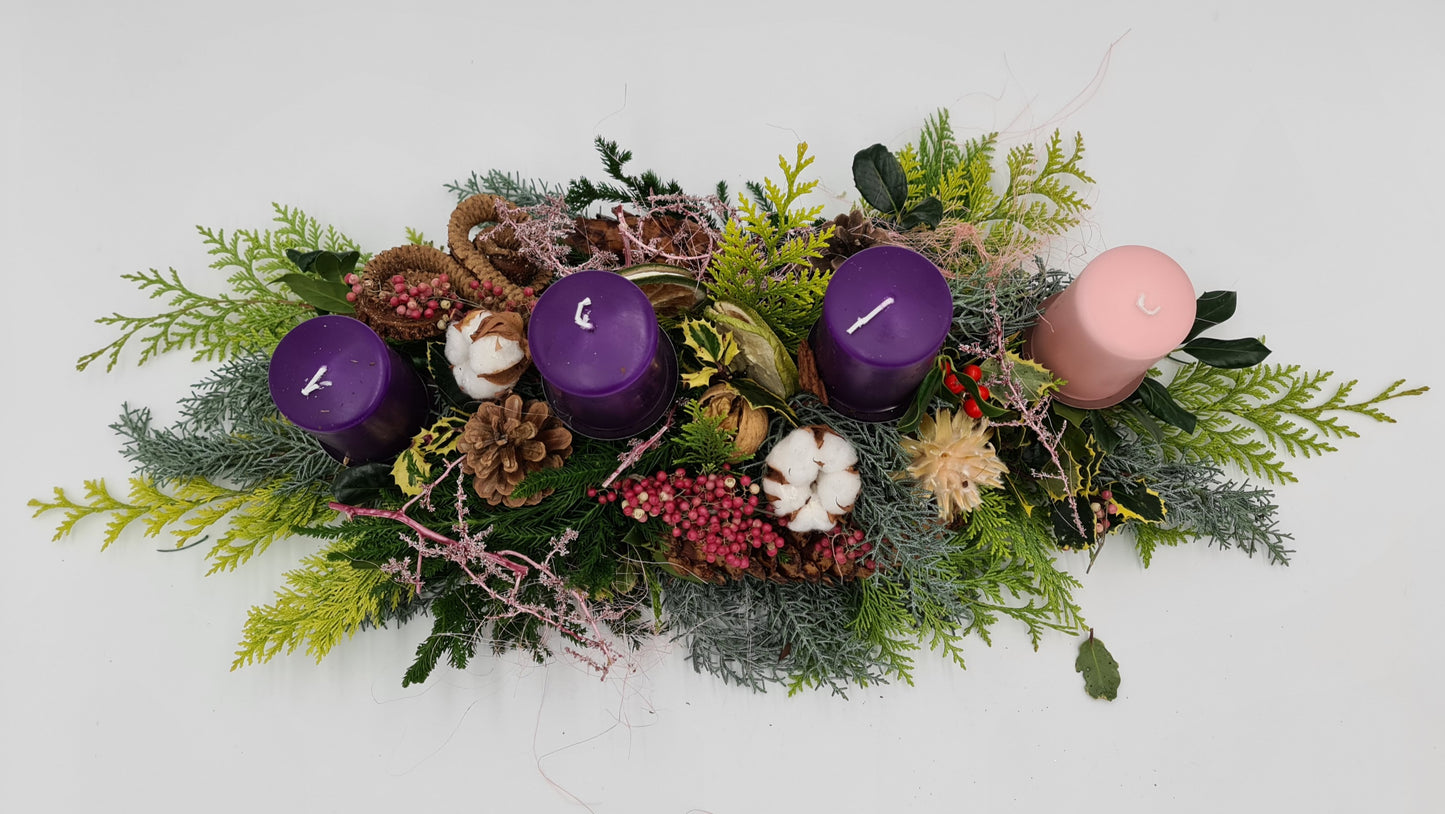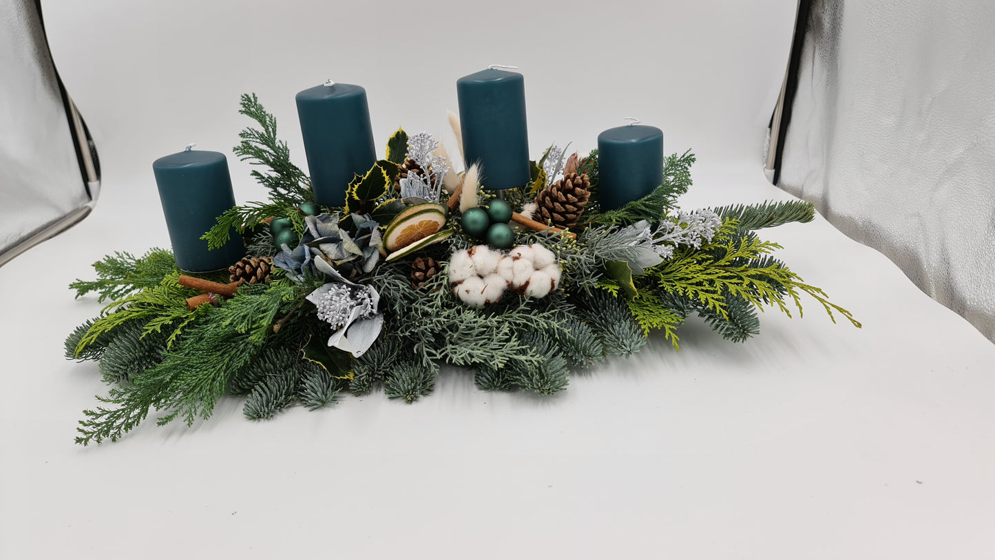 Das Adventsgesteck hat eine längliche Form mit Abmessungen von 55 cm in der Länge, 20 cm in der Breite und 25 cm in der Höhe. Es ist mit einer Vielzahl von Tannenreisig, Thuja, Eukalyptus und verschiedenen Koniferen geschmückt, was ihm eine natürliche und festliche Ausstrahlung verleiht.