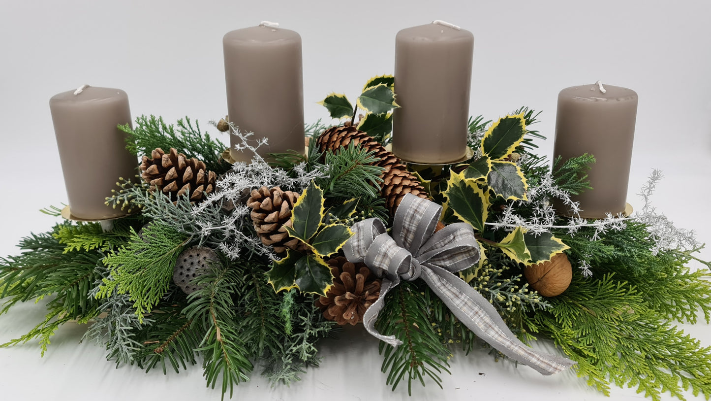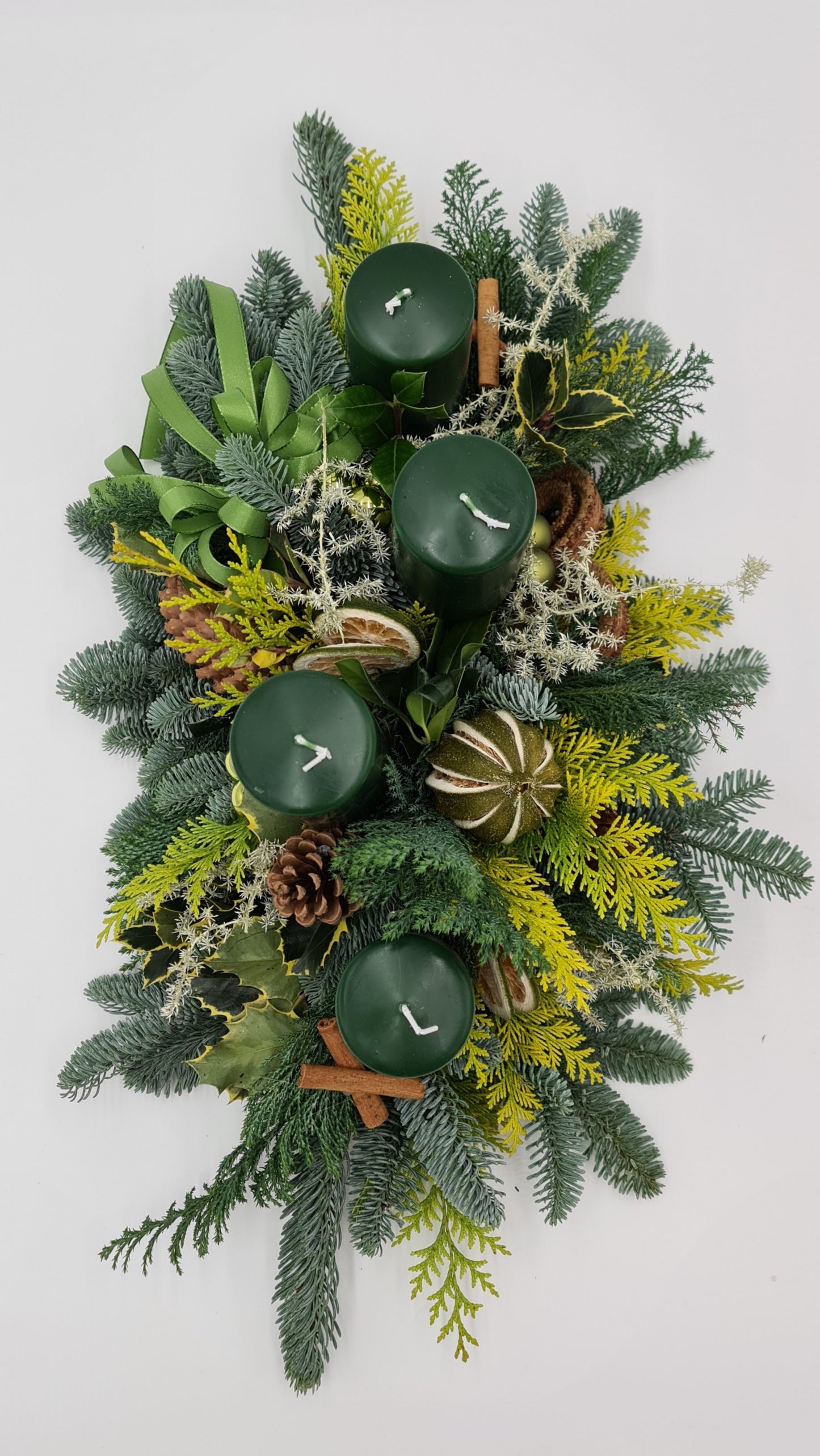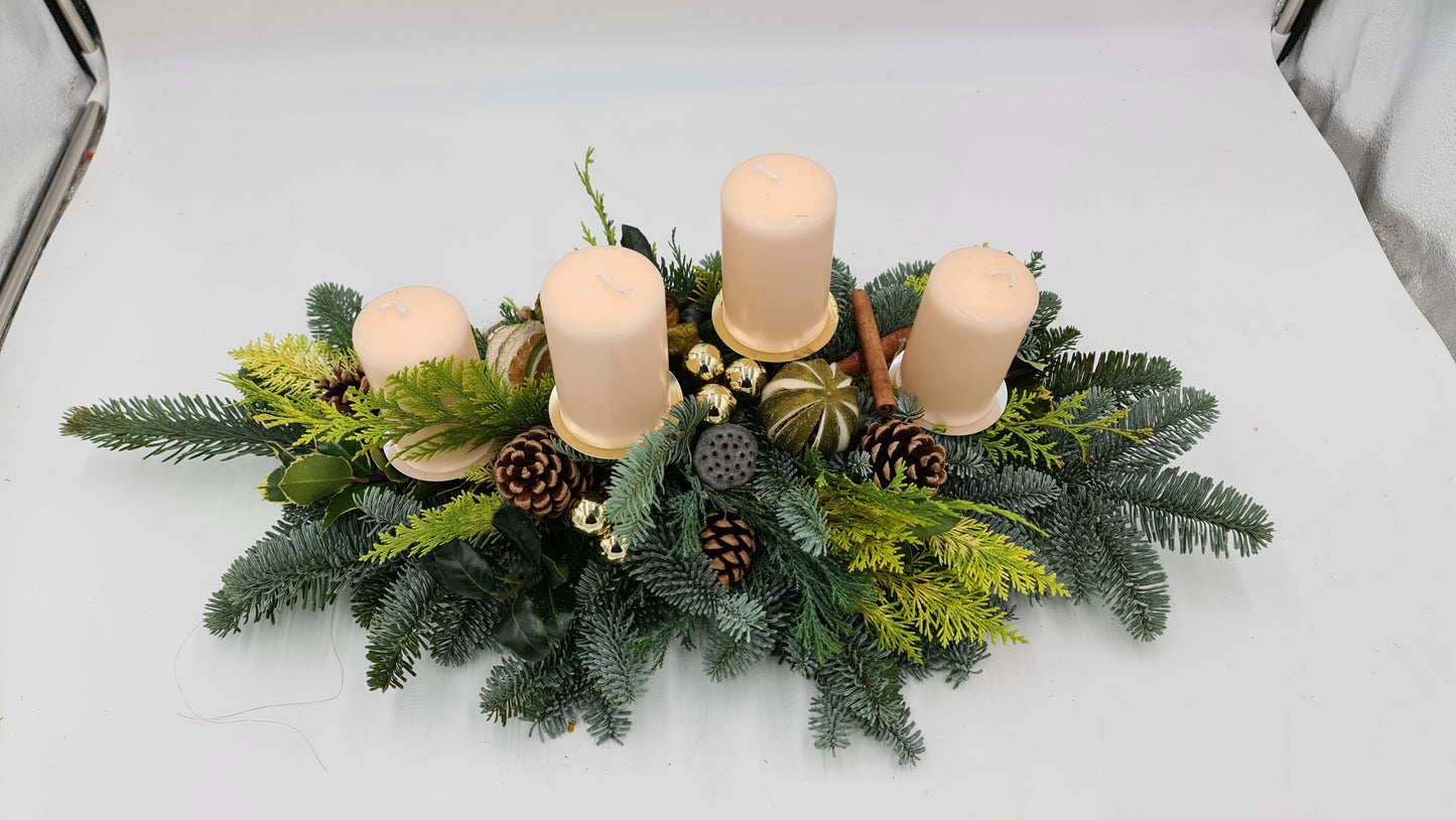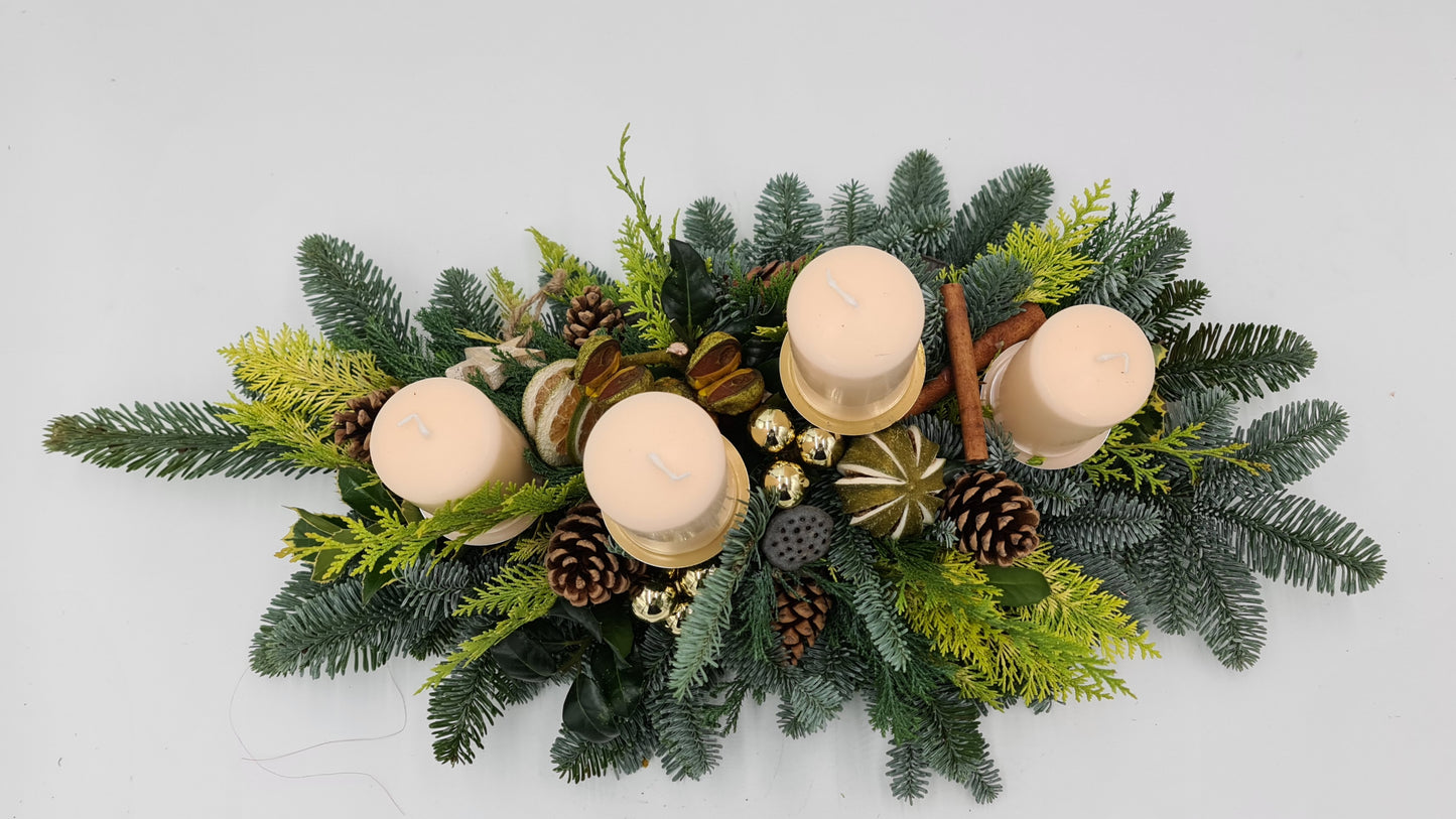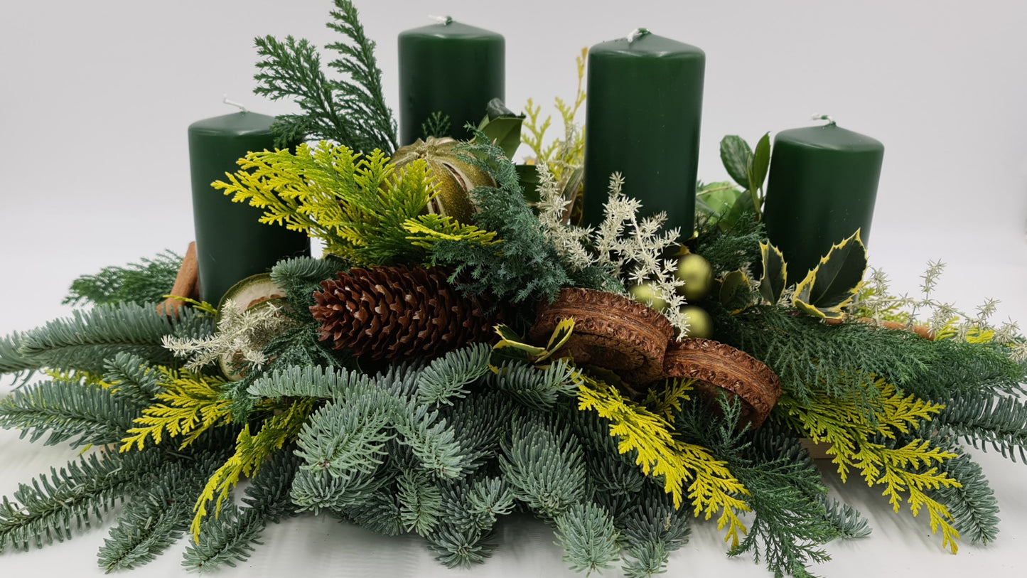 In der Mitte des Gestecks befinden sich vier Kerzen, die jeweils 100 mm hoch und 60 mm im Durchmesser sind. Diese Kerzen strahlen in warmen Farben und tragen zur besinnlichen Stimmung der Adventszeit bei. Die Kombination aus unterschiedlichen Grüntönen und der sanften Beleuchtung der Kerzen schafft eine einladende Atmosphäre, ideal für die Vorweihnachtszeit.