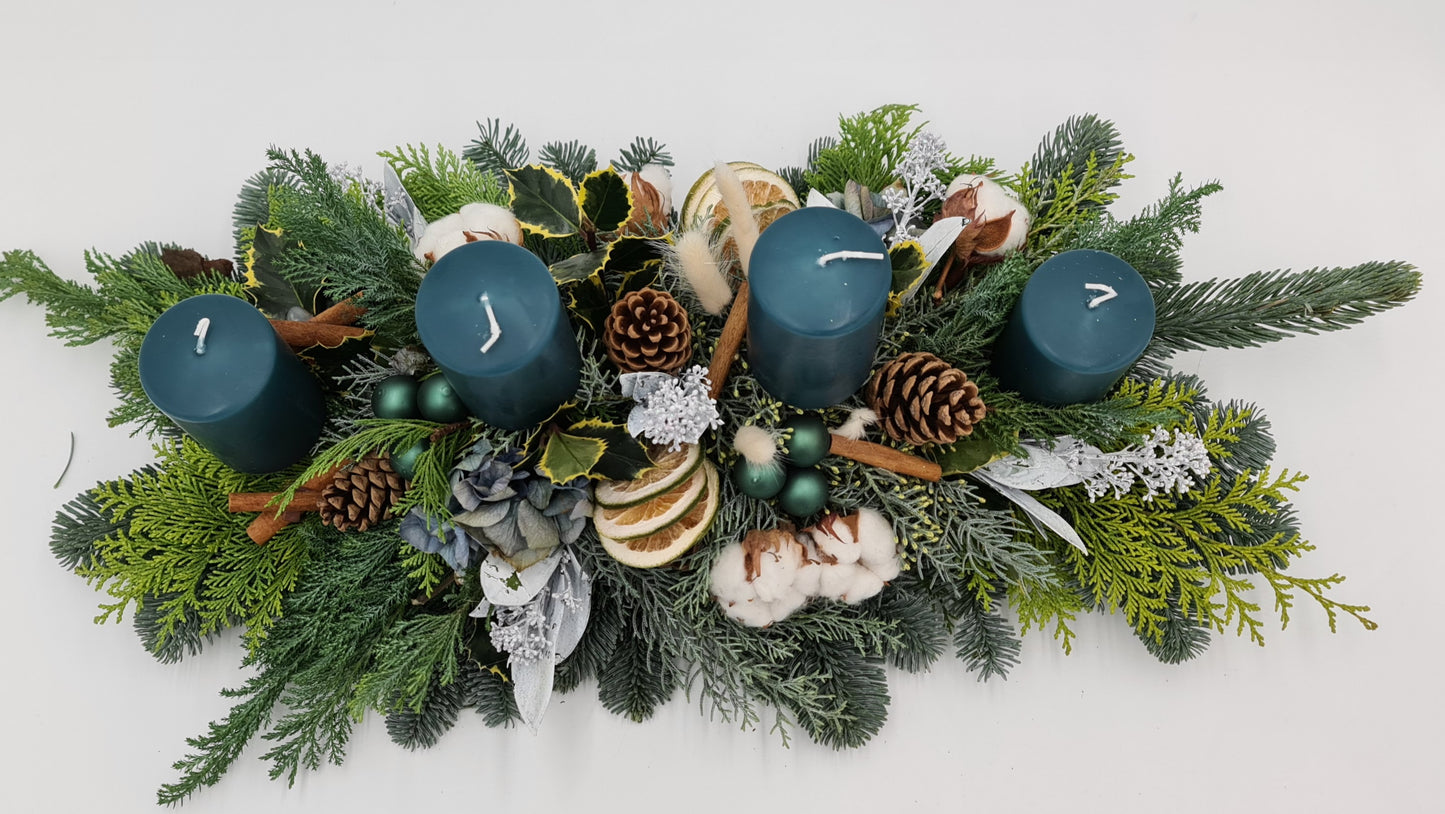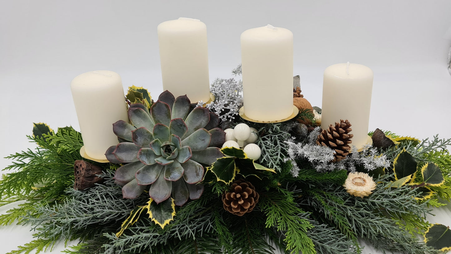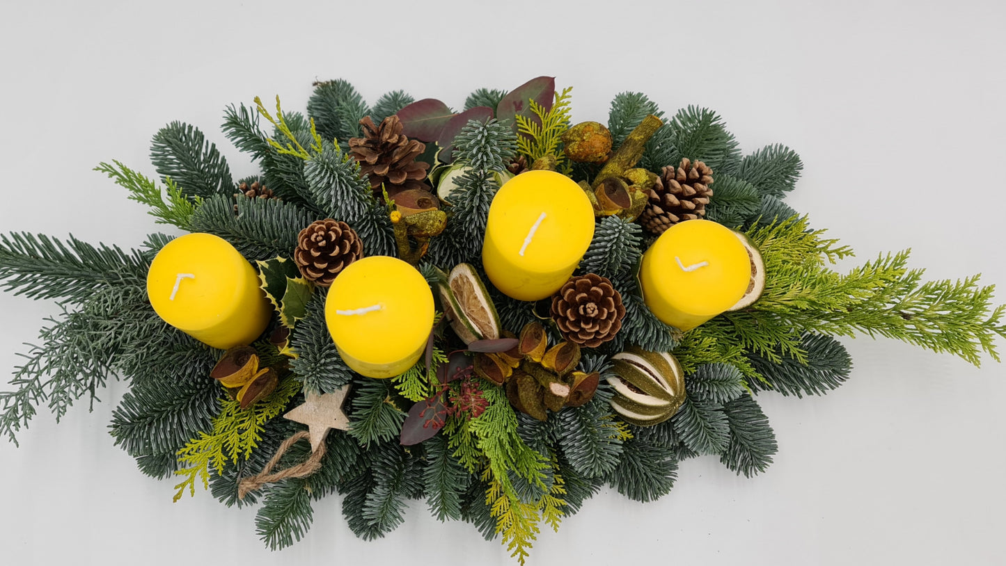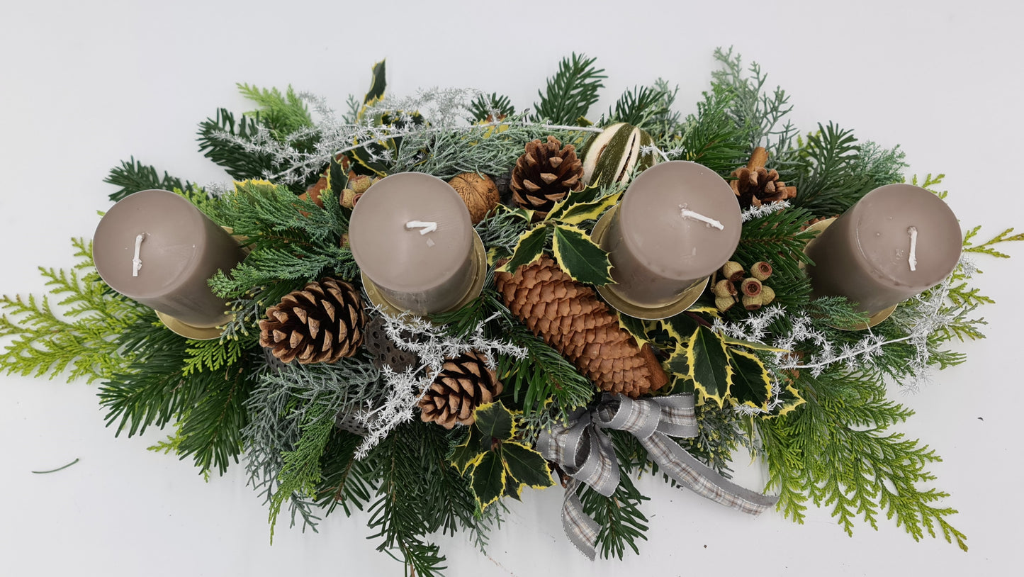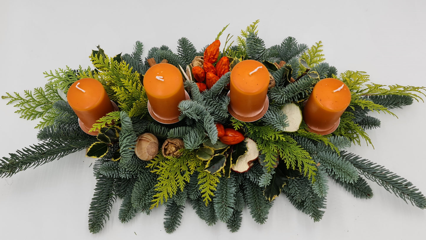In der Mitte des Gestecks befinden sich vier Kerzen, die jeweils 100 mm hoch und 60 mm im Durchmesser sind. Diese Kerzen strahlen in warmen Farben und tragen zur besinnlichen Stimmung der Adventszeit bei. Die Kombination aus unterschiedlichen Grüntönen und der sanften Beleuchtung der Kerzen schafft eine einladende Atmosphäre, ideal für die Vorweihnachtszeit.