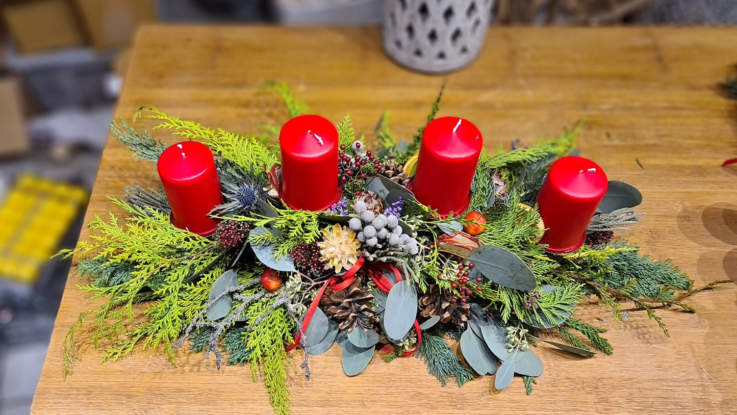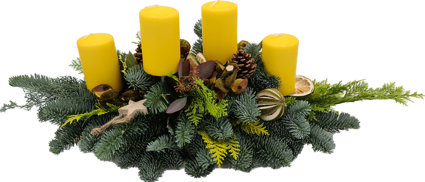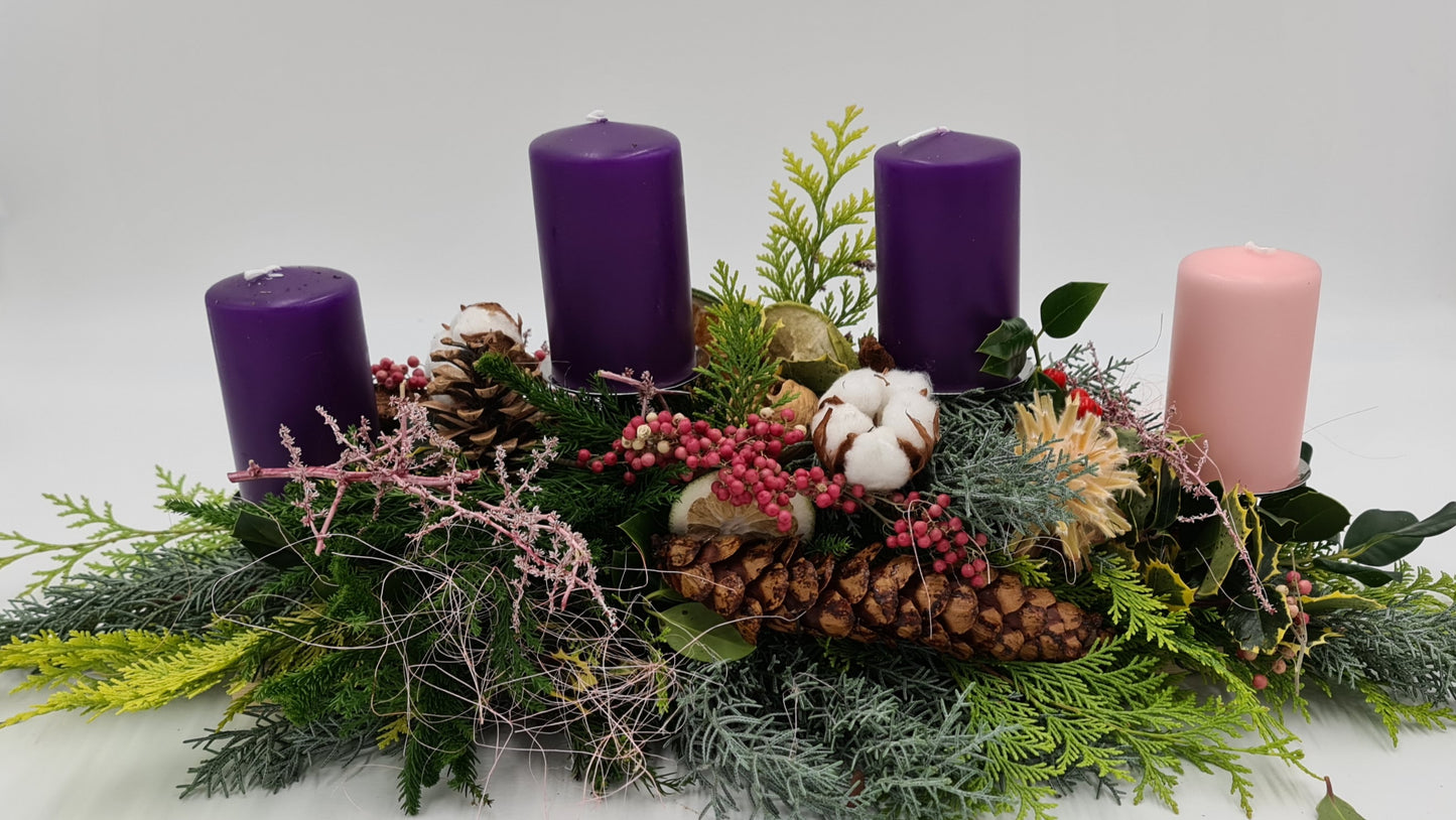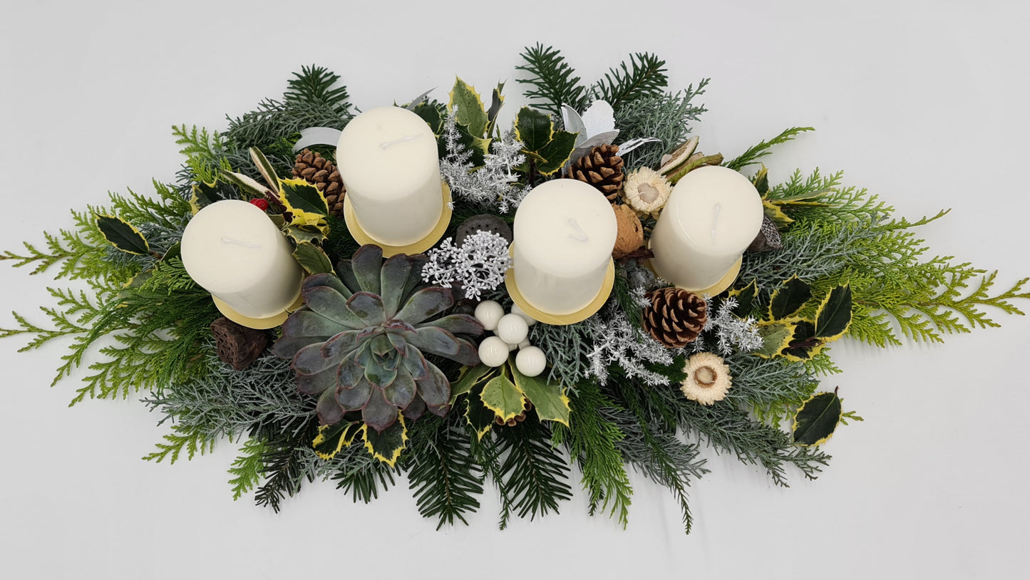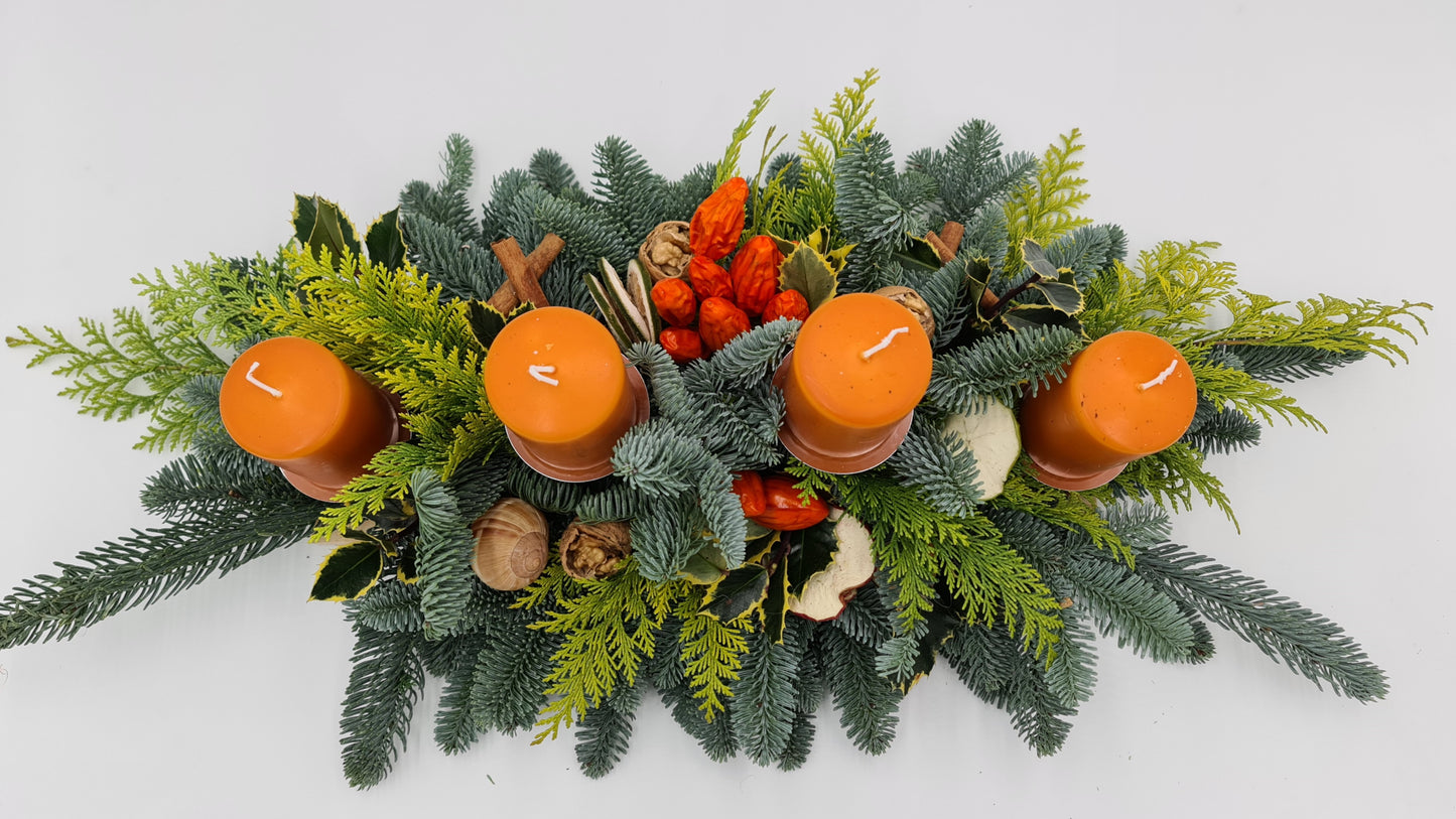In der Mitte des Gestecks befinden sich vier Kerzen, die jeweils 100 mm hoch und 60 mm im Durchmesser sind. Diese Kerzen strahlen in warmen Farben und tragen zur besinnlichen Stimmung der Adventszeit bei. Die Kombination aus unterschiedlichen Grüntönen und der sanften Beleuchtung der Kerzen schafft eine einladende Atmosphäre, ideal für die Vorweihnachtszeit.
