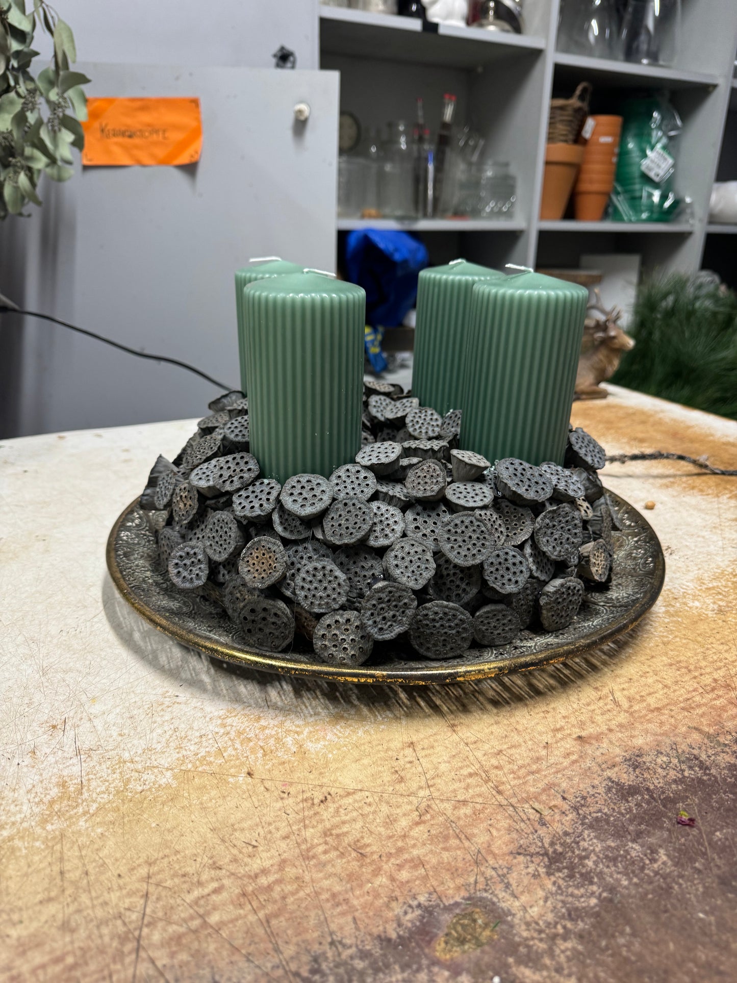 Der Adventskranz ist ein kunstvolles Arrangement aus natürlichen Materialien, das mit zarten Lotusblüten geschmückt ist. Diese Blüten verleihen dem Kranz eine exotische Eleganz und harmonieren wunderbar mit dem Grün des Kranzes, das eine warme und einladende Atmosphäre schafft.