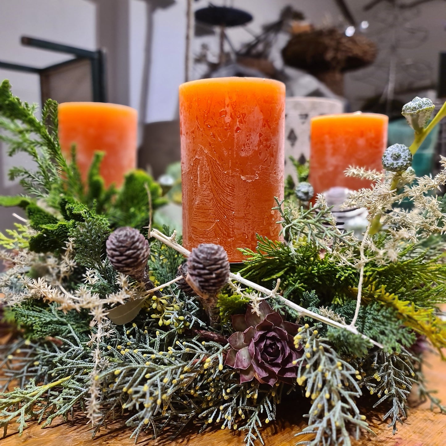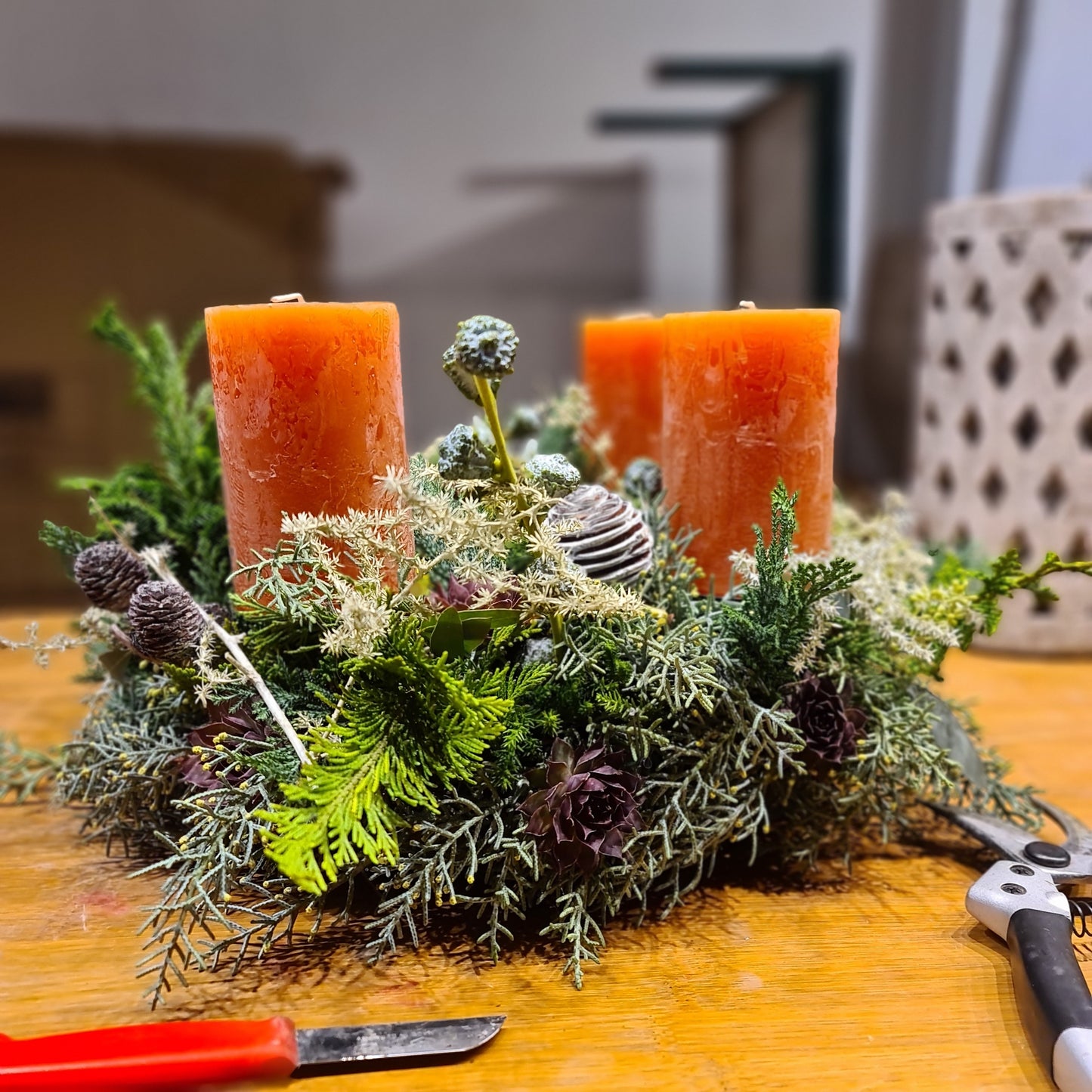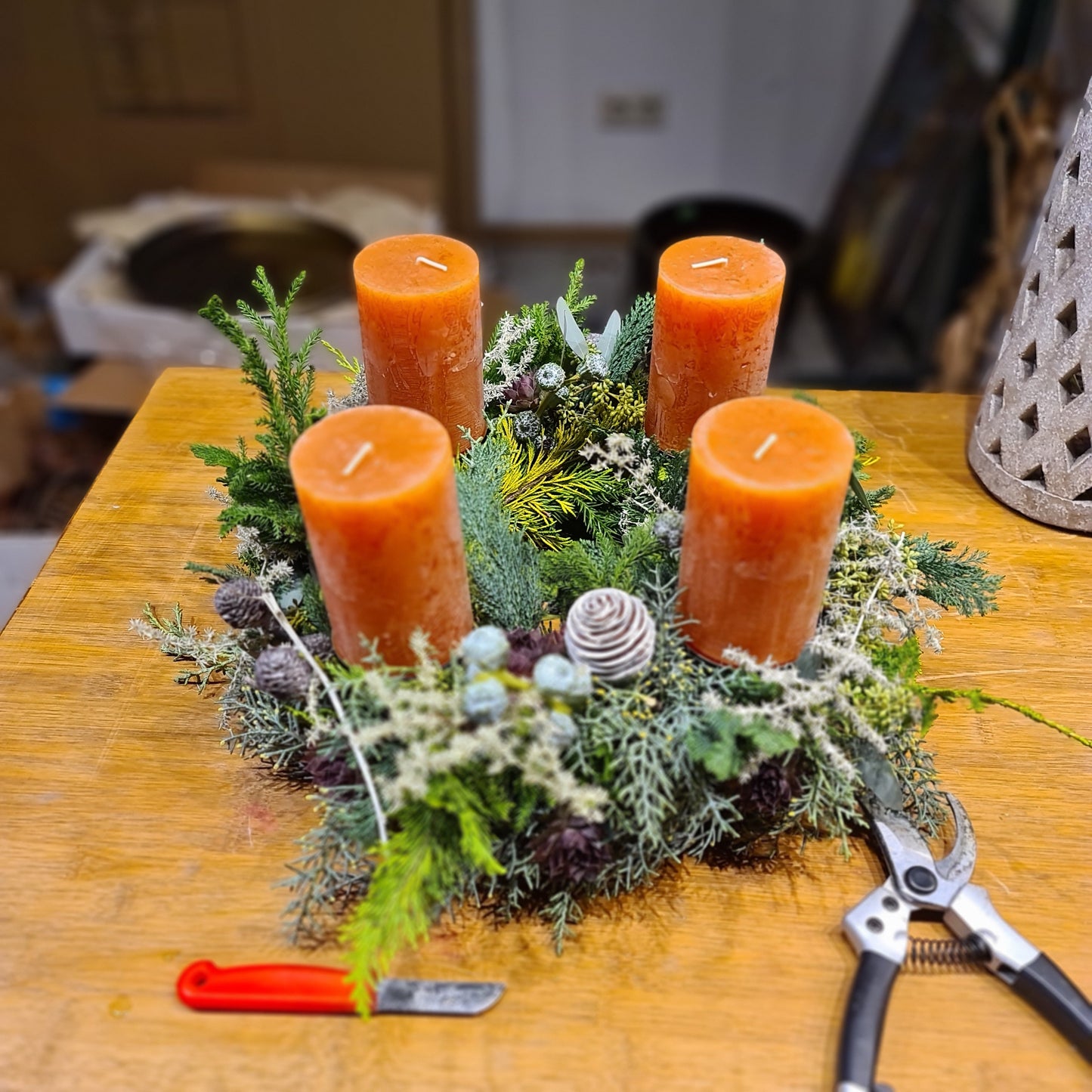 Hast Du schon mal daran gedacht, einen gesteckten Adventskranz zu machen, anstatt einen zu binden? Die Vorteile liegen klar auf der Hand: durch den Nasssteckschaum bleibt das winterliche Grün lange frisch und nadelt nicht. Außerdem kannst Du die feine Seidenkiefer und auch anderes Grün verwenden, das ohne Wasser schnell vertrocknen und nicht mehr schön aussehen würde. Seidenkiefer ist zwar ein Nadelgehölz, aber ohne Wasserversorgung und im beheizten Raum wird es schnell braun und verliert die Nadeln. Die robusten Schwarz- und Bergkiefern mit den dickeren Nadeln sind da unempfindlicher.