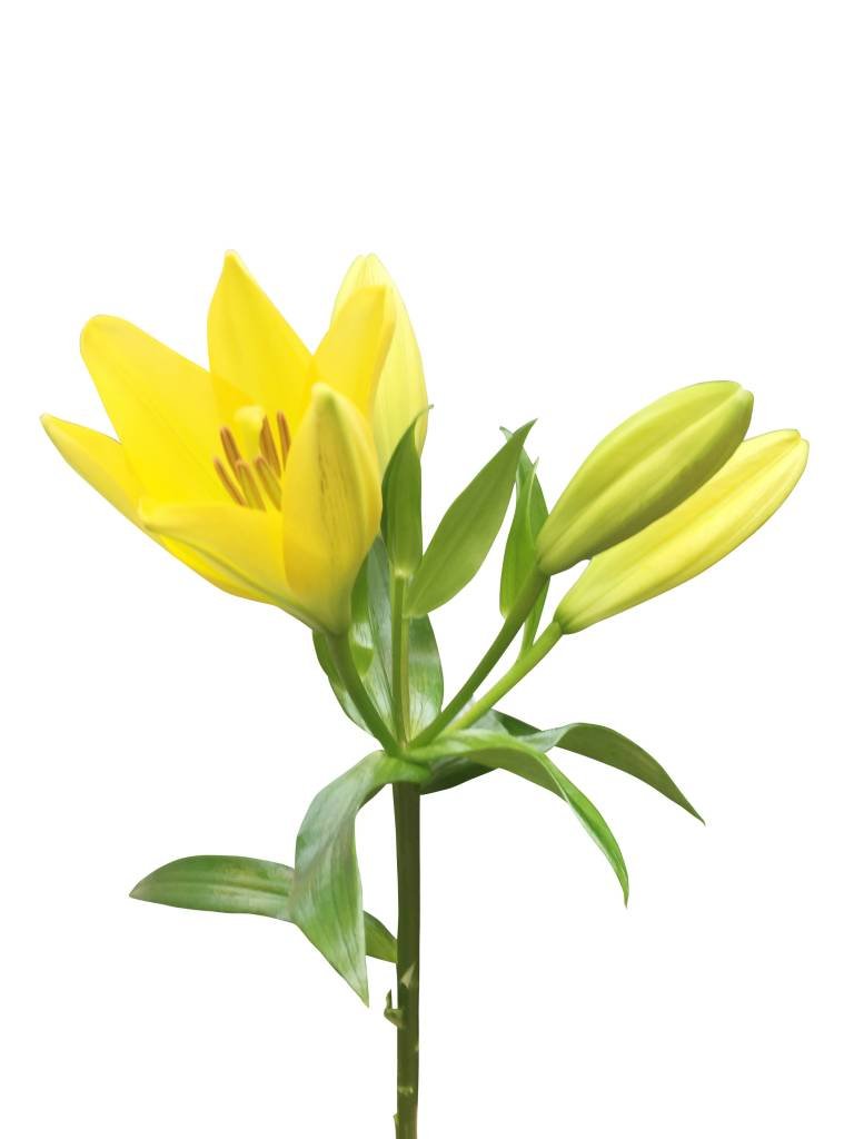 Die Lilie ist ein exotisches Meisterwerk der Natur. Mittlerweile gibt es weit über 100 Arten, die überall auf dem Globus verteilt sind. Was die Lilien für die Floristik so auszeichnet sind ihre Vielfalt, ihre ausgewogenen und speziellen Formen und Designs, ihre Farbspektren, ihre Leuchtkraft und nicht zuletzt ihre Anmut und Eleganz. Es ist kaum zu übersehen, dass diese Lilie alle diese Aspekte umfasst. Ihre Blüte besteht aus sechs strahlend gelben und kraftvoll leuchtenden Blütenblättern, die allesamt harmonisch zur Farbe des Blütenstandes passen. Sie ist sehr lang und mit zierlichen Blättern geschmückt, die ähnlich geformt sind, wie die Blütenhüllblätter.